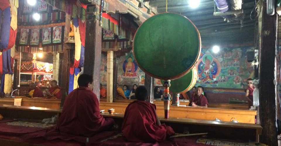 O poschodí níž už se scházejí všichni monastiční mniši, mladí, staří i děti, všichni mají vyholené hlavy a červené róby, nejprve dostanou občerstvení - jejich typický tibetský slaně máslový čaj a k tomu kaši. To je budhistická tradice, nejprve se posilnit a pak až se pustit do vykonávaní náboženských rituálů. Chrám je napřed jídelnou a nepozorovaně se pak proměňuje na na zvučný chrám v jehož stěnách rezonují zpěvy a mantry, ozvěny bubnů a hlasných trub. Unikátní představení, jemuž přihlíží náhodní příchozí.