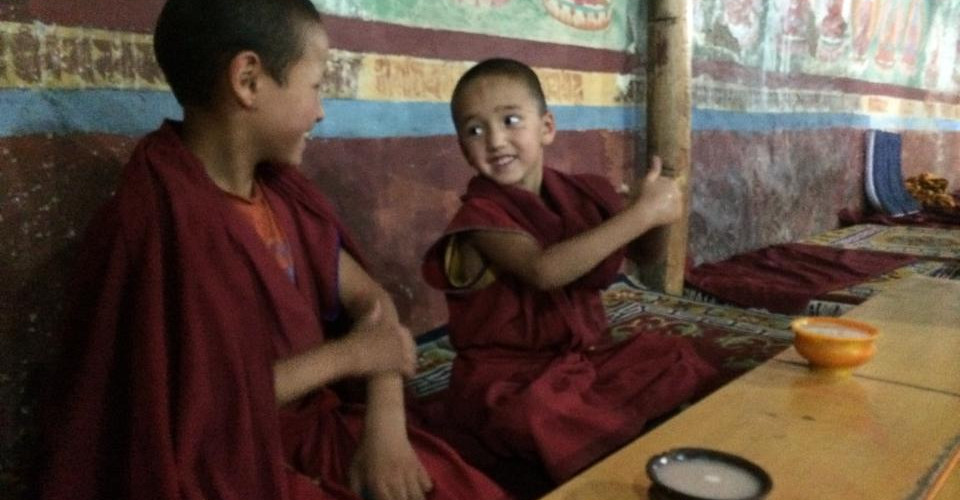 Roztomilí jsou dva malincí mniši, kteří se evidentně nudí, ještě asi neprokoukli taje tibetské moudrosti a tak se válí na madracích, dělají opičky a kotrmelce, jsou rozverní a neposední, vyvádějí stejně jako všechny děti na světě. Toto chování se ovšem nesnese s přísným řádem a asketickým jednáním mnišského řádu, dostanou vyhubováno od starších, sice s laskavým pohledem a milostným tónem, ale velice zřetelně. Najednou jako by se proměnili, sedí jako solné sloupy, recitují mantry a jsou dokonalou součástí tohoto budhistického hudebního představení. Před jídlem si čistí ruce desinfekčním gelem od výrobce Himalaya a je evidentní, že jim chutná, protože ho i lízají:-)